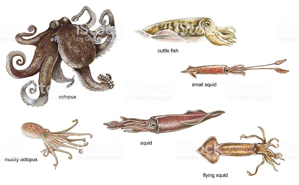 Les trois fournisseurs les plus importants aujourd'hui sont au niveau commercial : le calmar, la seiche et le poulpe. Les calmars et les seiches sont des décapodes, c'est-à-dire qu'ils ont huit bras et deux tentacules, les poulpes sont des octopodes, avec huit bras. Les deux bras, comme les tentacules, sont riches en cellules tactiles.